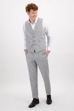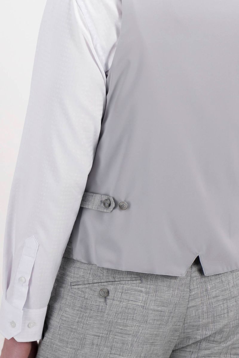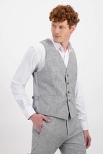 Chaleco formal de lino para hombre slim fit, color gris jaspe de la marca lmental, con 5 botones frontales, bolsillos falsos laterales, espalda en contraste y ajuste a dos niveles con botón.